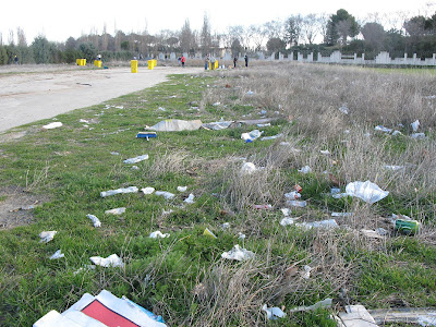 «A pesar de la fría mañana del sábado 9 de enero, cuatro personas voluntarias (dos de Alcorcón y dos de Leganés), más un educador del Centro, estuvimos adecentando las cunetas del camino de acceso de Alcorcón al Parque y los aledaños del antiguo aparcamiento clandestino (hoy recuperado de nuevo como campo de cultivo de cereal). Se recogieron dos cubos de restos de envases (botellas de plástico y latas), medio cubo de botellas de vidrio (ver fotos), una batería de coche y un filtro de aceite, que han sido convenientemente llevados a los contenedores de recogida selectiva correspondientes y al Punto Limpio del barrio de Arroyo Culebro. De este modo, esta acción colectiva sobre el medio ambiente, como actividad de educación ambiental, consigue simultáneamente tres objetivos: minimizar impactos ambientales, regenerar espacios comunes y agrupar a personas comprometidas. De hecho, gracias a las repetidas intervenciones en estos lugares (enero 2007, febrero 2009, enero 2010) se ha conseguido que el antiguo aparcamiento clandestino se haya convertido de nuevo en un campo de cereal, además se inicien unas obras de ampliación del aparcamiento de Alcorcón, y el ayuntamiento de Leganés envie periodicamente unas cuadrillas de limpieza para adecentar el camino. ¡¡La educación ambiental puede servir para transformar la realidad!! ¡Animaros para la próxima!»